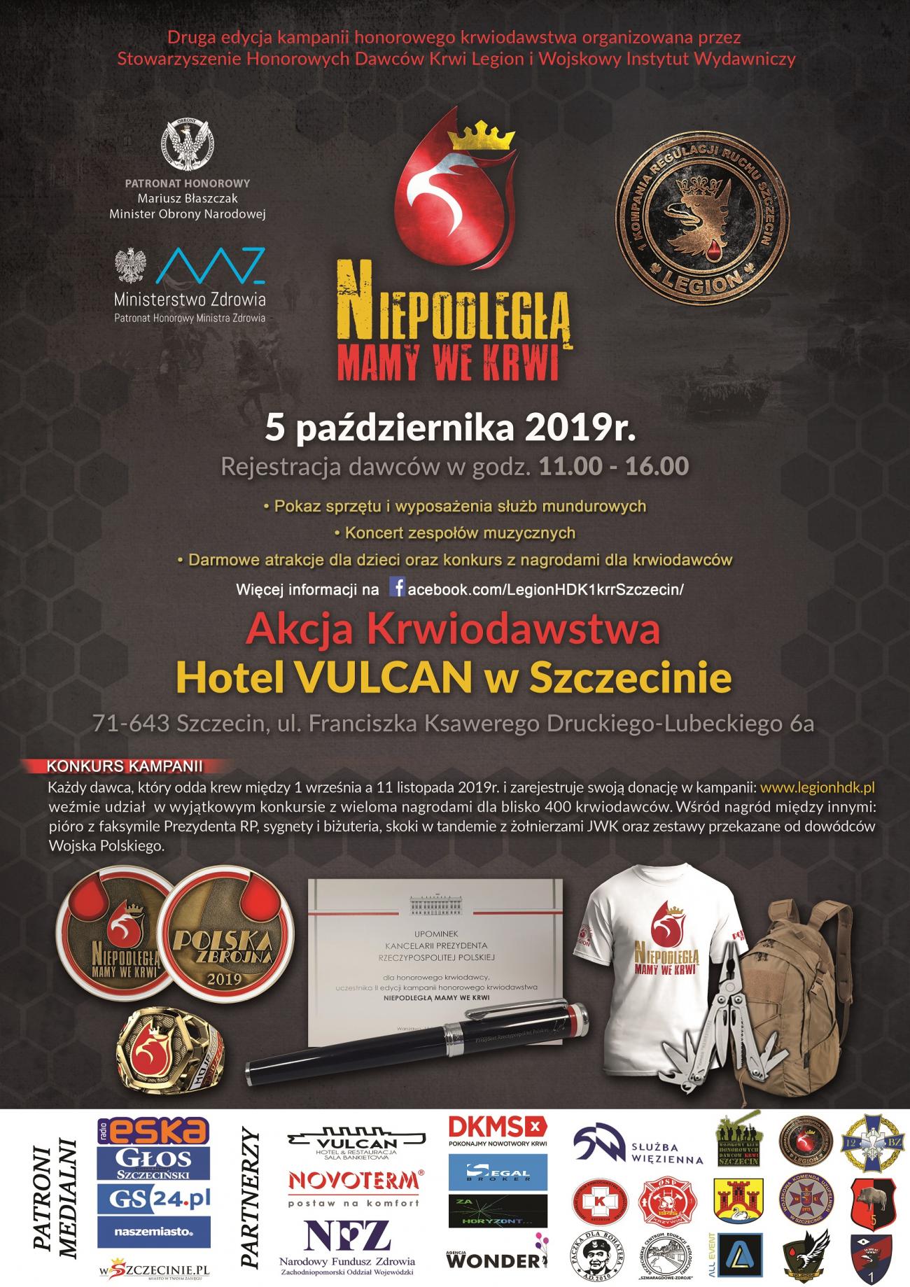 Akcję organizuje Stowarzyszenie Honorowych Dawców Krwi LEGION Oddział przy 1. kompanii regulacji ruchu w Szczecinie przy wsparciu i pomocy Regionalnego Centrum Krwiodawstwa i Krwiolecznictwa w Szczecinie. Wydarzenie będzie częścią ogólnopolskiej akcji o tej samej nazwie mającej na celu zbiórkę bezcennej krwi oraz upamiętnienie odzyskania przez Polskę niepodległości. Kampania "Niepodległą mamy we krwi" została objęta honorowym patronatem Ministra Obrony Narodowej oraz Ministra Zdrowia.