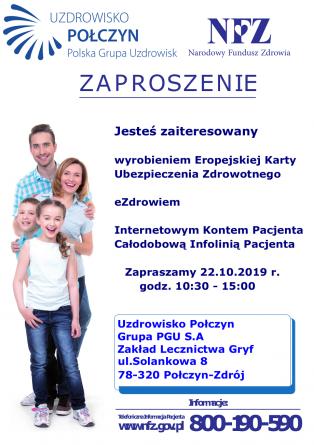 Zachodniopomorski OW NFZ kontynuuje akcję „Mobilny NFZ w trasie”. We wtorek, 22 października, w godz. 10.30 – 15.00 będziemy w Zakładzie Lecznictwa „Gryf” w Połczynie-Zdroju przy ul. Solankowej 8. Zapraszamy osoby zainteresowane wyrobieniem EKUZ - Europejskiej Karty Ubezpieczenia Zdrowotnego, aktywowaniem Internetowego Konta Pacjenta, e-zdrowiem, bezpłatnymi dietami oraz TIP - całodobową informacją telefoniczną