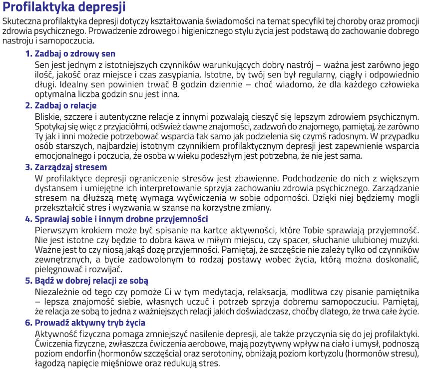 Pomaga zmniejszyć nasilenie depresji, ale także przyczynia się do jej zapobiegania. Ćwiczenia fizyczne mają pozytywny wpływ na ciało i umysł, dzięki nim wytwarzają się endorfiny – hormony szczęścia. - Ograniczenie stresów.