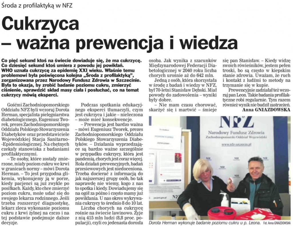 Najbliższa Środa z Profilaktyką, w dniu 26 lutego, poświęcona będzie cukrzycy. Gośćmi Zachodniopomorskiego Oddziału NFZ będą: specjalista pielęgniarstwa diabetologicznego p. Dorota Herman; Prezes Zachodniopomorskiego Oddziału Polskiego Stowarzyszenia Diabetyków p. Eugeniusz Tworek oraz Sanepid, czyli Wojewódzka Stacja Sanitarno Epidemiologiczna, która wystawi swoje stanowisko z badaniami profilaktycznymi.