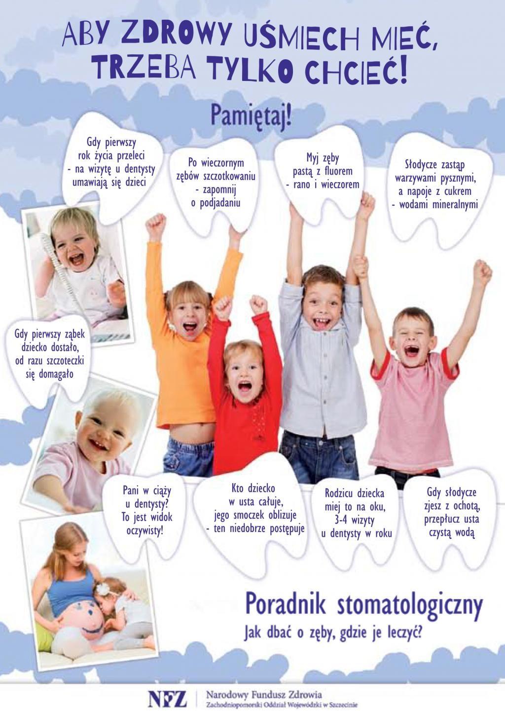 Poradniki stomatologiczne, plakaty i ulotki trafiają systematycznie do żłobków, przedszkoli, pierwszych klas szkoły podstawowej oraz do szkół rodzenia i są wsparciem dla projektu ZOW NFZ realizowanego we współpracy z partnerami, którymi są promotorzy zdrowia z Wojewódzkiej Stacji Sanitarno-Epidemiologicznej w Szczecinie oraz stacji powiatowych oraz świadczeniodawcy związani z ZOW NFZ umowami w zakresie medycyny szkolnej, realizujący opiekę nad dziećmi w młodszych klasach szkoły podstawowej, tj. pielęgniarki szkolne, w miejscu nauczania i wychowania.