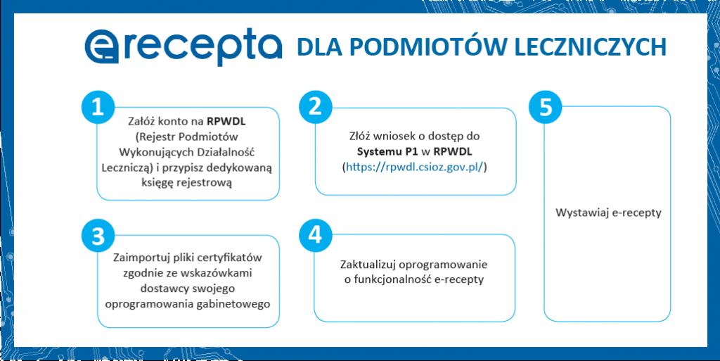 W 2019 roku wszystkie szpitale, przychodnie, poradnie, izby przyjęć oraz pozostałe podmioty, w których wystawiane są recepty, mają obowiązek zarejestrować się w systemie e-zdrowie, na platformie P1. Tylko dzięki temu lekarze będą mogli wystawiać pacjentom recepty elektroniczne. Ostateczny termin na wdrożenie e-recepty przez podmioty lecznicze i lekarzy upływa 31 grudnia 2019 roku. Od 1 stycznia 2020 roku w aptekach realizowane będą wyłącznie recepty wystawione elektronicznie!