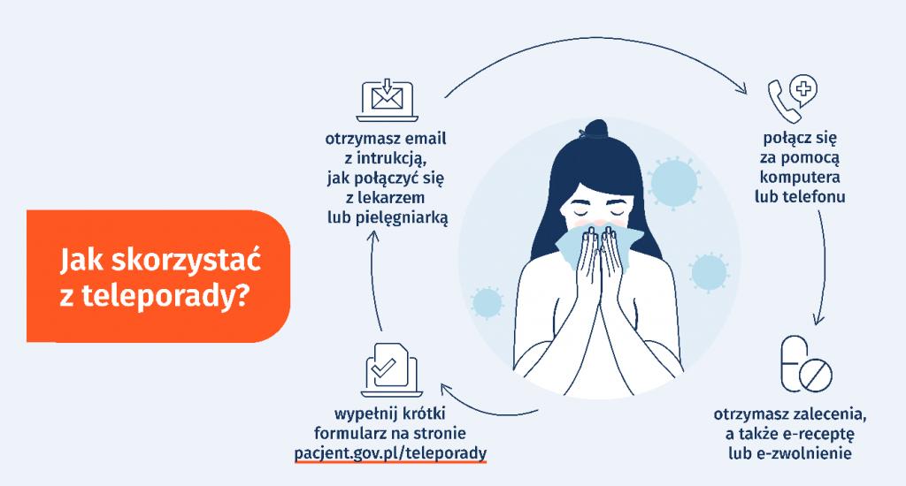 Dzięki teleporadzie pacjent zyskuje dostęp do porady medycznej niezależnie od miejsca, w którym jest, a także pory dnia, ponieważ personel medyczny jest dostępny przez 24 godziny na dobę, także w niedzielę i święta. Podczas konsultacji, o ile zajdzie taka potrzeba, pacjent otrzyma e-receptę i e-zwolnienie, a w uzasadnionych przypadkach zalecenie wizyty w placówce medycznej lub kontaktu ze stacją sanitarno-epidemiologiczną.