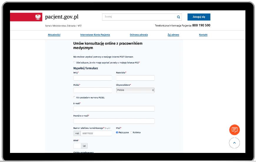 Formularz teleporady dostępny jest na stronie: pacjent.gov.pl/teleporada >>> Należy go wypełnić, podając imię, nazwisko, wiek, PESEL, adres, mail, telefon i zaczekać na kontakt z pracownikiem medyczny. Na podany adres e-mail otrzymamy wiadomość z instrukcją, jak połączyć się z lekarzem lub pielęgniarką za pomocą komputera, laptopa lub przez telefon. Komputer lub laptop musi mieć głośniki, kamerę i mikrofon. Jeżeli nie mamy dostępu do odpowiedniego sprzętu, możemy skorzystać z telefonu.